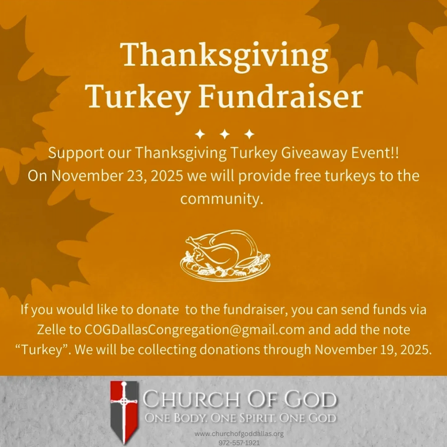 - If you would like to donate funds, please send via Zelle to COGDallasCongregation@gmail.com through Nov. 19th. Please add 'Turkey ' as a note so we can allocate the funds appropriately.